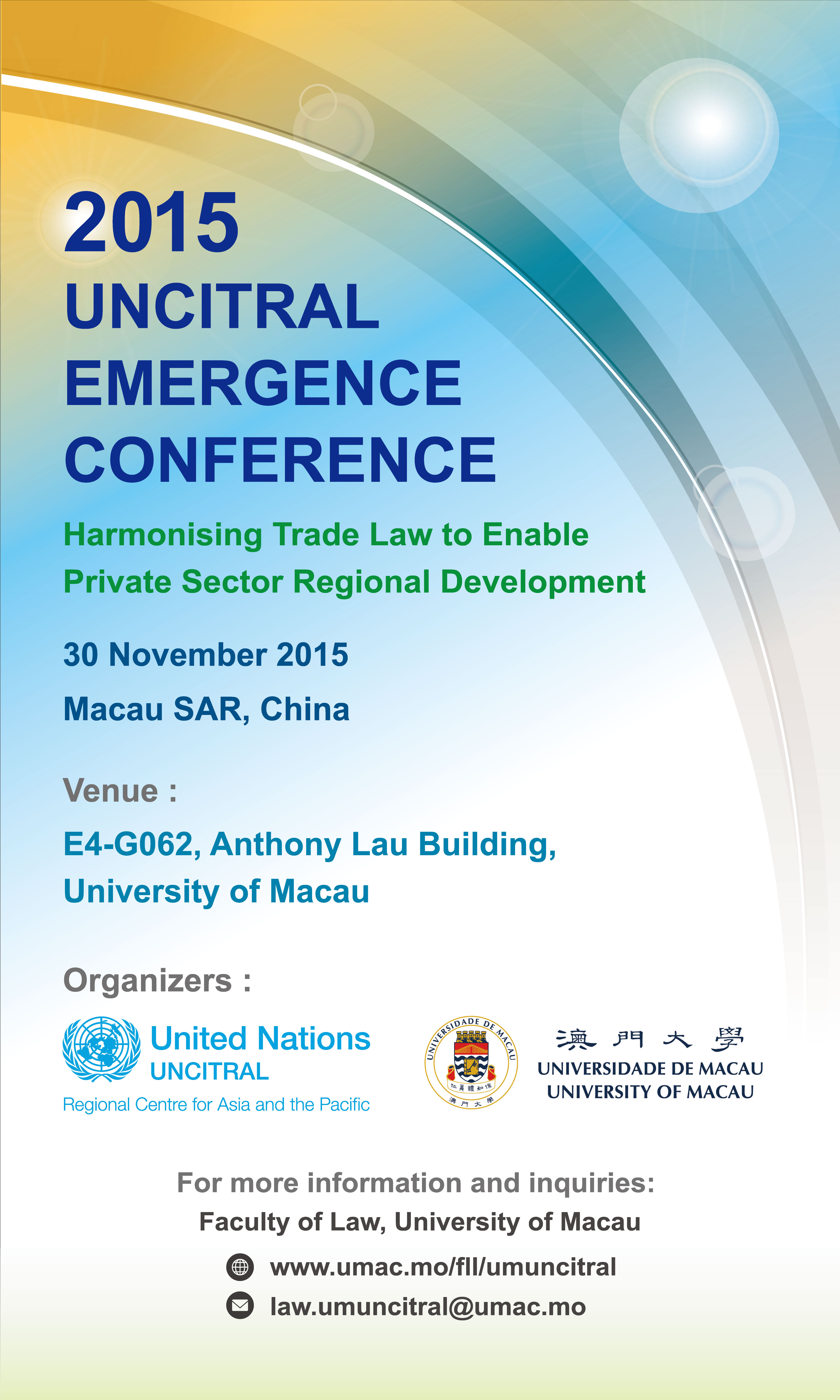 由澳門大學法學院和聯合國國際貿易法委員會亞太區域中心聯合主辦的“2015聯合國國際貿易法委員會 (UNCITRAL) 前沿研討會"將於11月30日上午9時在澳大劉少榮樓E4-G062演講廳舉行,歡迎有興趣人士參與。 繼去年十月研討會圓滿舉辦,澳大法學院再度與聯合國國際貿易法委員會合辦國際會議,以“貿易法協調與私營企業區域發展”為題,探討當代商法統一與協調過程中出現的最新發展趨勢及其對區域商業環境的影響、國際貿易法和聯合國國際貿易法委員會示範法相關的重要議題,以及當代全球面臨的一系列國際貿易法及商法問題,包括“中小微型企業”、“國際商事仲裁”、 “電子商務”、“跨國破產”以及“國際合同法”五大議題。與會者有來自澳洲、美國、瑞典、日本、印度、新加坡、中國內地、香港、台灣和澳門的專家學者。 歡迎有興趣人士參與,查詢請與澳大法學院曹小姐聯繫,電話:8822 4191,或瀏覽會議網頁www.umac.mo/fll/umuncitral獲取相關信息。 新聞來源:法學院 媒體聯繫: 澳門大學傳訊部 李巧雲 電話:(853) 88228004 余偉業 電話:(853) 88224322