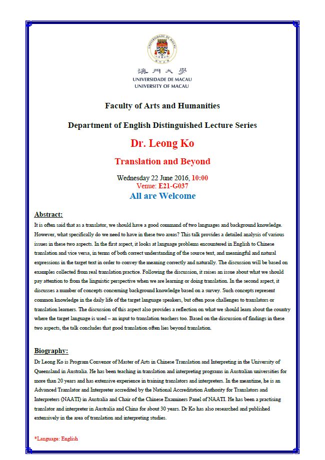 人文學院英文系講座 - Leong Ko博士, 昆士蘭大學, 澳洲 |
