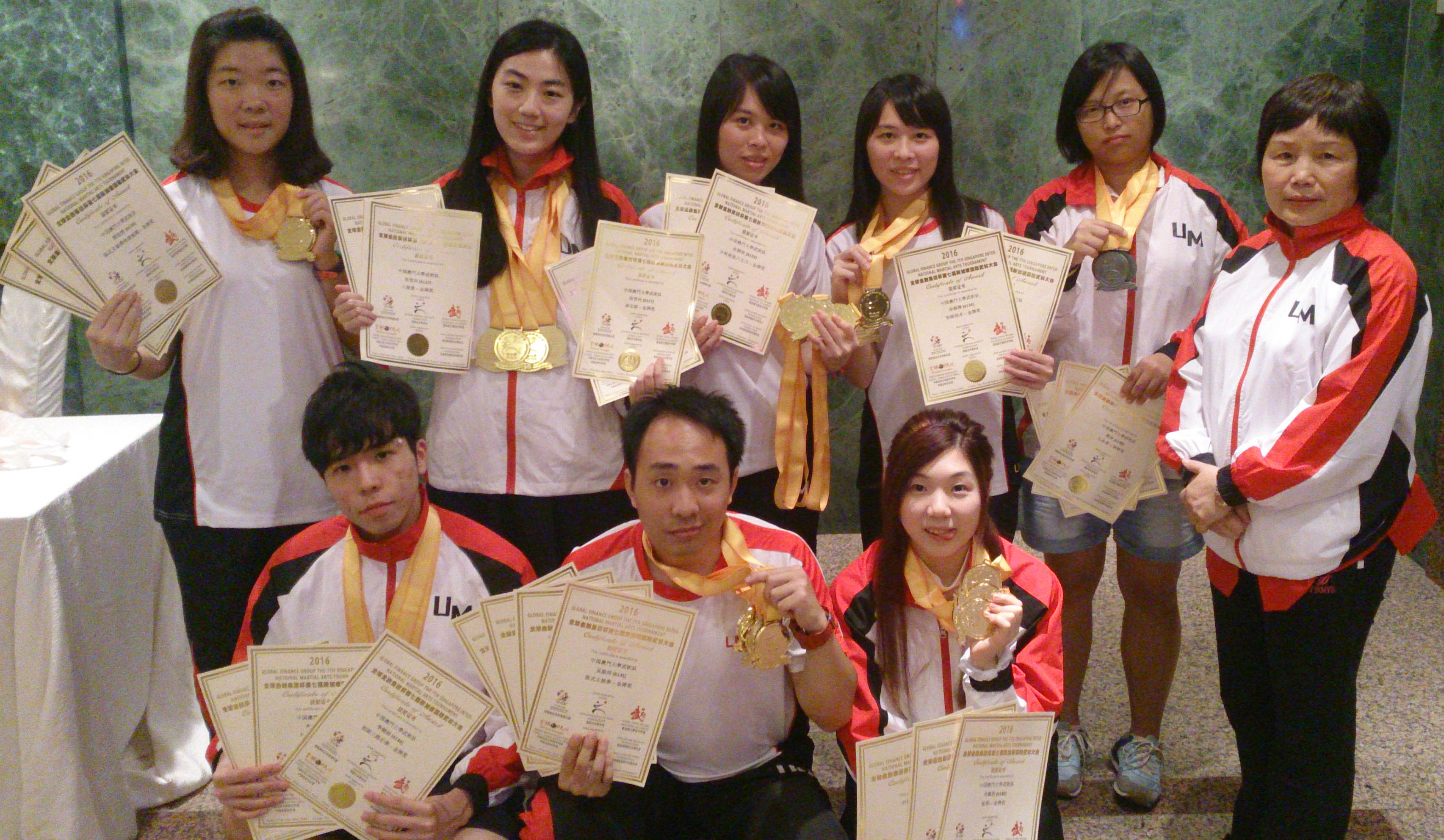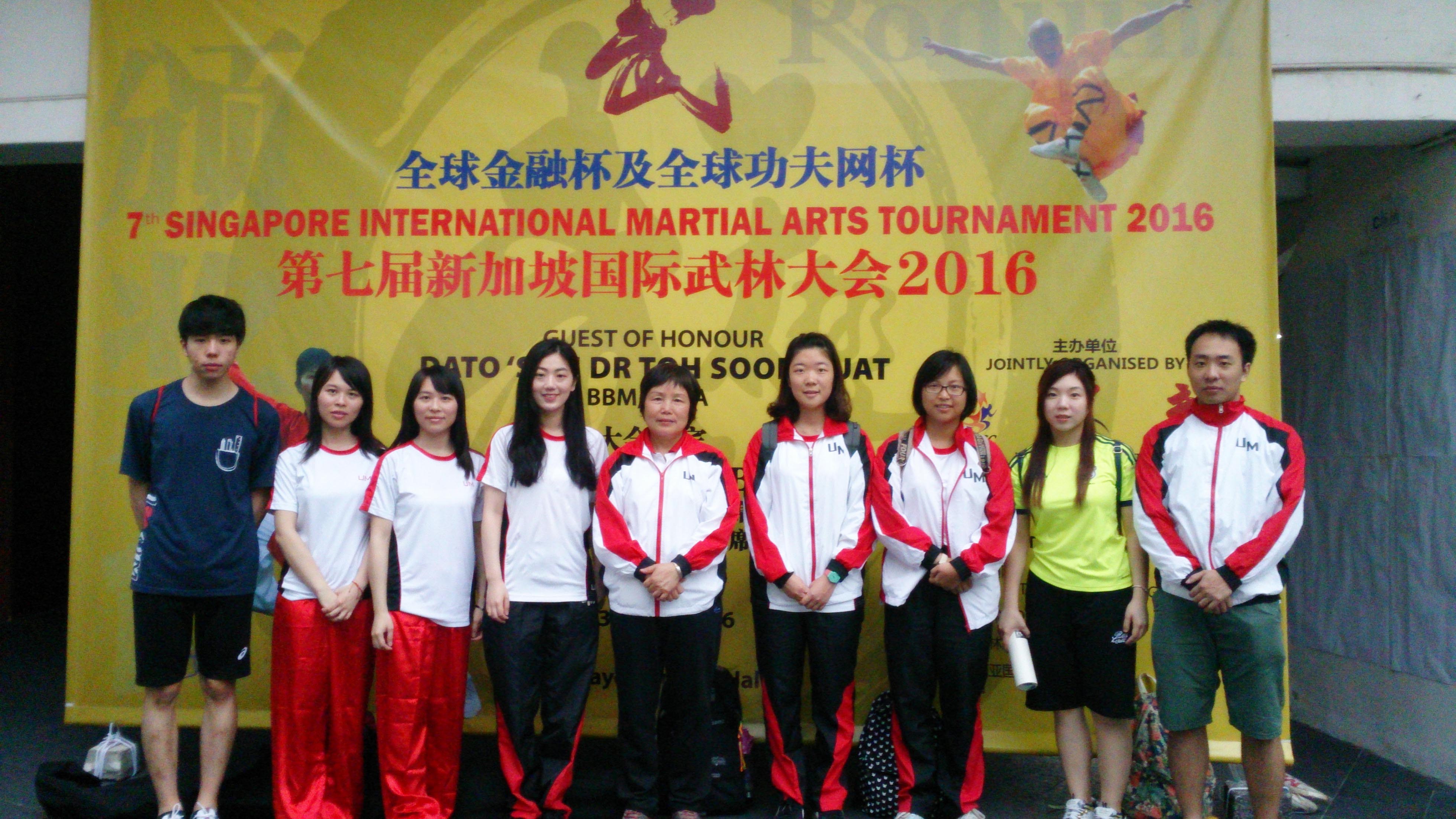 澳門大學武術隊遠赴新加坡,出戰第七屆新加坡國際武林大會,與來自世界各地30多個國家67支代表隊近千五名武將選手同場競技交流,並力壓群雄,勇奪21金、4銀及3銅佳績。 澳大共派出8名武將參賽,其中科技學院余穎欣在少林南派八方刀、太和拳、小八極和五步拳奪得金牌獎;工商管理學院的余穎琳奪得初級三路長拳、初級劍術、初級棍術金牌獎和五步拳銀牌獎;社會科學學院、紹邦書院的李健添奪得初級三路長拳金牌獎、初級棍術和五步拳銅牌獎;教育學院、滿珍紀念書院的韋佩程奪得蛇拳、梅花十八劍和游龍槍金牌獎;同為教育學院、何鴻燊東亞書院的吳振邦在陳式太極拳、南槍、雙刀和工字伏虎拳奪得金牌獎;科技學院、蔡繼有書院的郭欣然奪得陳式太極拳傳統套路、陳式太極劍傳統套路金牌獎和五步拳銀牌獎;法學院研究生范雪珂在八極拳、八卦掌、南北扇和少林南派刀奪得金牌獎;人文學院研究生譚茜奪得初級三路長拳、初級棍術銀牌獎和五步拳銅牌獎。是次參賽的澳大武術隊教練為黎任芳。 今屆國際武林大會在新加坡大巴窯體育館隆重舉行,由國際功夫聯合會、新加坡功夫聯合會聯合主辦。大賽競賽項目眾多,大致分拳術類(長拳、南拳及其他拳類)、太極拳類、長短器械類,以及其他各种養生功法。 新聞來源:體育事務部 媒體聯繫: 澳門大學傳訊部 李巧雲 電話:(853) 88228004 余偉業 電話:(853) 88224322